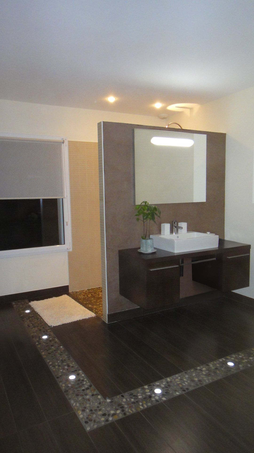 - La création d'une cloison permet un aménagement original et non conventionnel pour cette salle de bain : cette cloison sert de paroi de douche et crée une intimité.Elle n'atteint le plafond afin de laisser passer la lumière et de conserver l'harmonie des volumes .