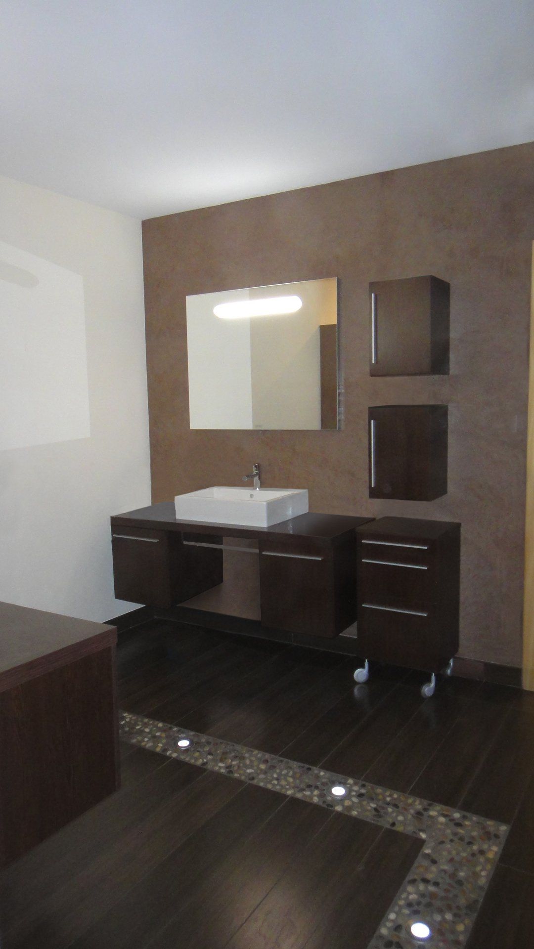 - 2 meubles vasques en vis à vis ,agencement original qui permet d'avoir 2 plans de grandes dimensions.Rangements supplémentaires à hauteur côté femme.